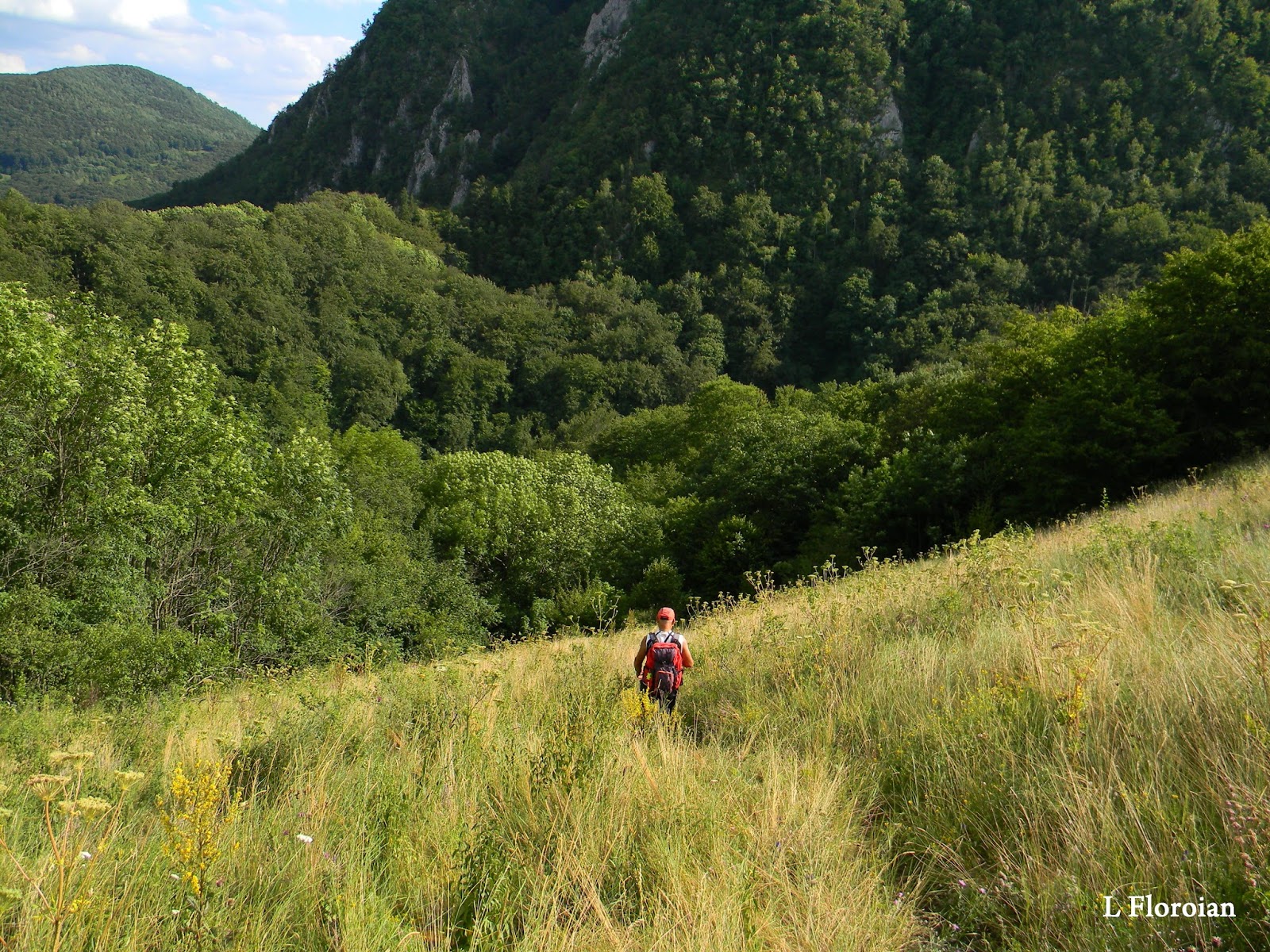 Coboram si cautam marcajul de coborare in chei prin iarba inalta si multe potecute ! Aici ne-am cam incurcat ,negasind marcajul din prima.