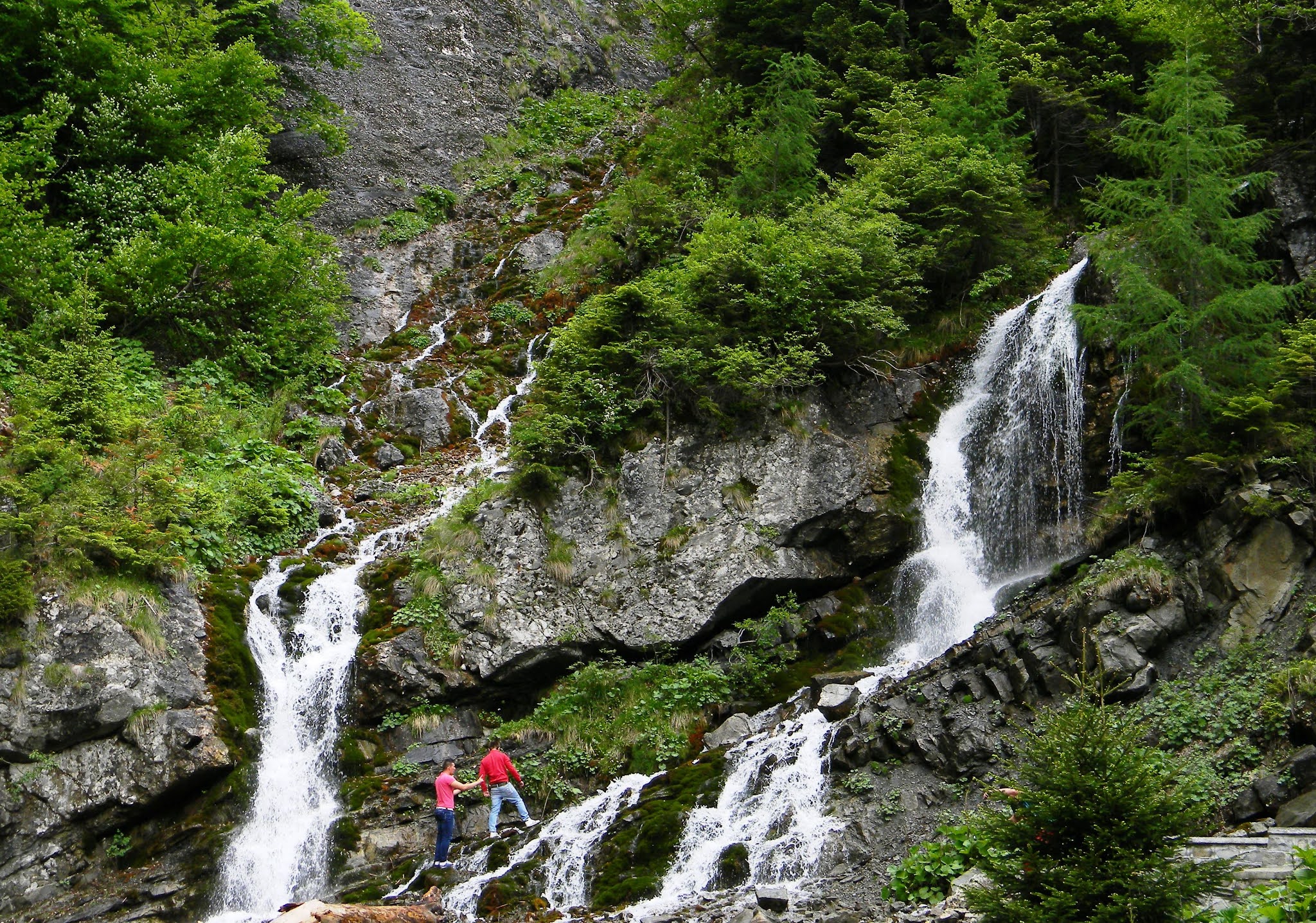 In timp ce ma invarteam eu pe aici in cautarea drumului ,vin niste tineri si mai nestiutori decat mine,ei cautau drumul spre cascada Urlatoarea:)))) Le povestesc eu cum stau lucrurile cu cascadele si uitand de Urlatoarea ,urcam impreuna pe o panta cu tufisuri chiar perpendiculara pe firul vaii si dupa un urcus printre crengi de brad de nu vedeam unde calcam iesim dintr-o data langa refugiul Salvamont .Deja eram la locul cautat,se auzeau cascadele care sunt un pic mai sus.De fapt exista drum de urcat prin dreapta dar noi nu l-am vazut pur si simplu....