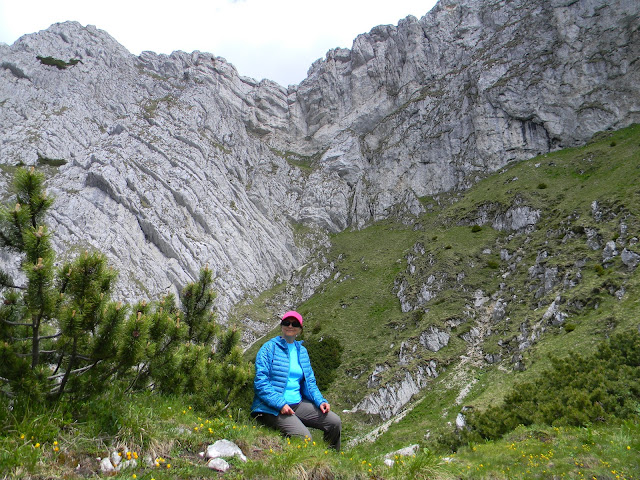 Iesim din grohotis si urcam o panta inierbata iar mai sus pe o poteca prin jnepenis,unde trebuie sa fim atenti sa nu o pierdem.La un moment dat am pierdut poteca si m-am trezit intr-un loc unde nu mai puteam inainta,asa ca a trebuit sa revin sa caut poteca,deoarece am ramas in urma grupului si nici nu cunosteam traseul!Un lucru ce nu trebuie sa se intample pe munte unde toti formam o echipa iar ritmul mersului ar trebui stabilit ca fiind al celui ce merge mai incet !Eu fac multe poze,mai admir peisajul ca doar pentru asta fac atata efort ,in timp ce altii pun capul in poteca si trag tare sa ajunga primii sus ! Din aceasta cauza prefer grup mic de pana la 3-4 coechipieri in felul acesta ne putem sincroniza perfect si astfel ramanem un grup compact ceea ce e recomandabil pe munte ! Am vazut grupuri de 40-50 persoane insirate pe cativa km ceea ce nu mi se pare normal.